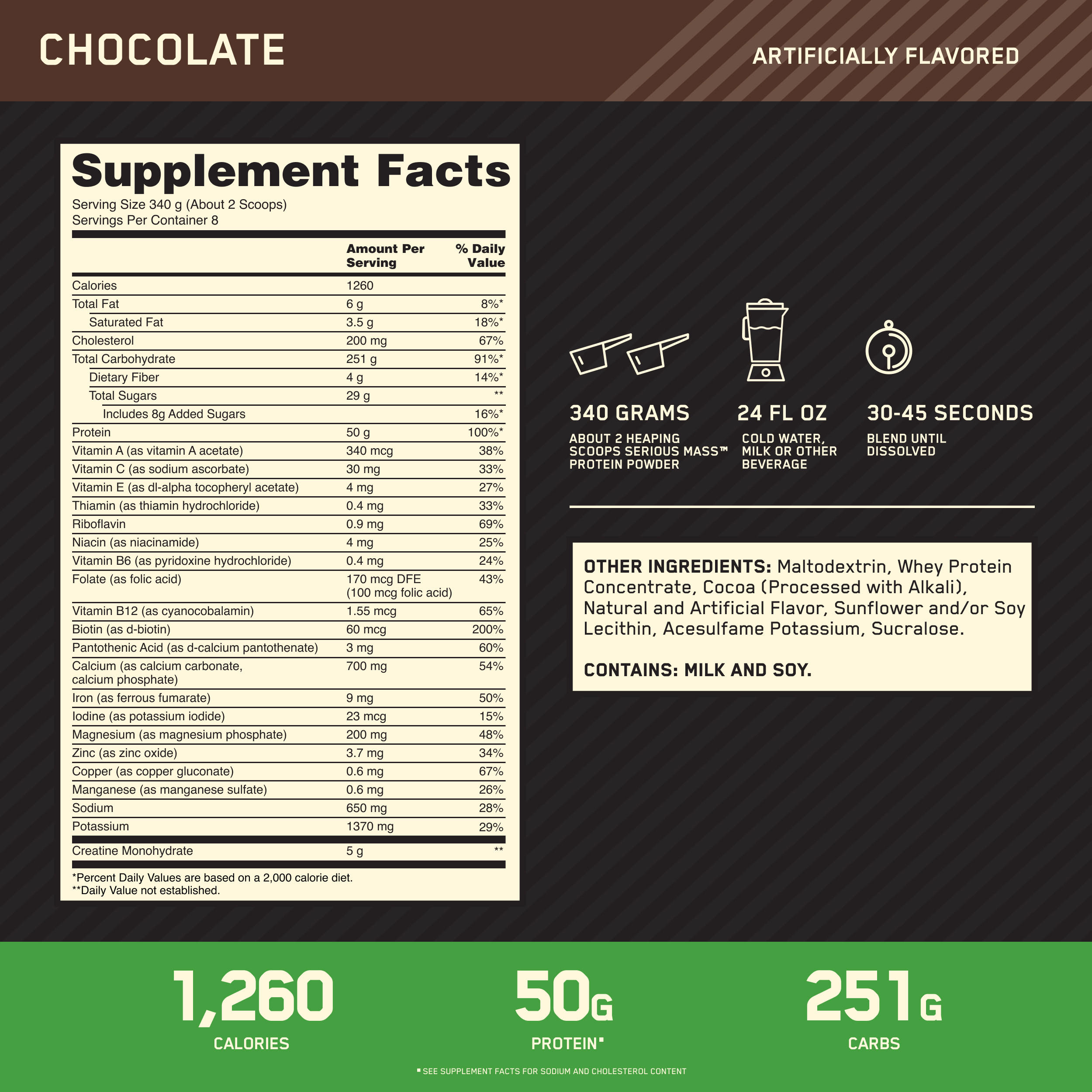 Now available with added Creatine to boost your performance in the weight room. 25 vitamins and minerals. Optimum Nutrition Serious Mass Serious Mass is the ultimate in weight gain formulas.